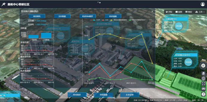 在智慧化运营管理中,首先利用无人机对奥帆中心区域10个楼体及1平方公里范围内实景进行拍摄,完成三维实景精细建模,建成一个网络版的人机交互展示系统,并可通过网络访问,满足不同地点访问的需求,为智慧运维、演示、示范推广、科普等需求提供完善的影像基础。然后通过建设区域能源控制平台(能耗监测、智慧管控),打造智慧能源控制系统,实现实时大数据分析及可视化展示。