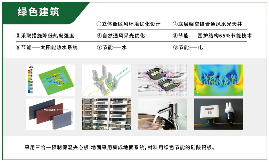 绿色技术——宁波市等地项目按绿色建筑二星标准设计,在住宅屋面上设置太阳能光伏面板,兼顾一定保温功能和有效提升住宅自发电比例,与其他可再生能源结合,形成互补供电模式。